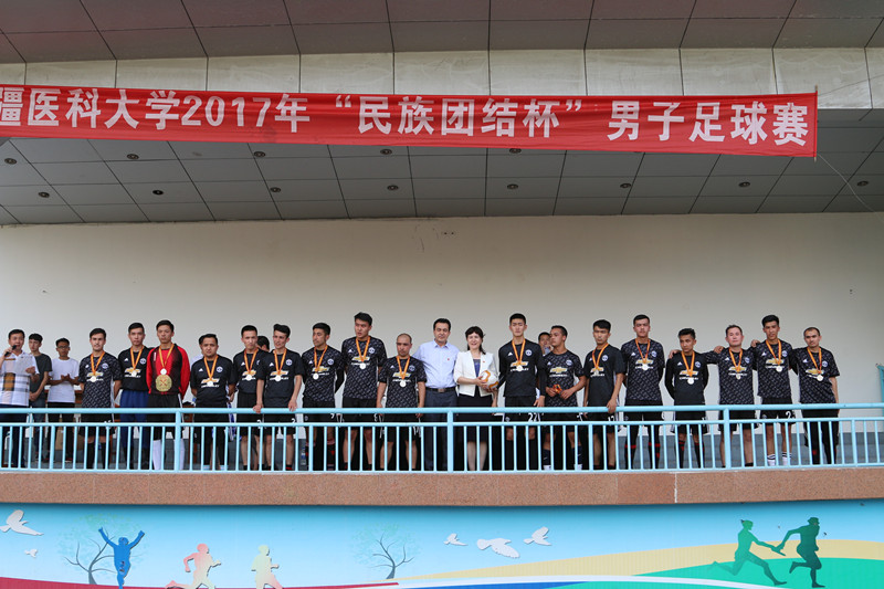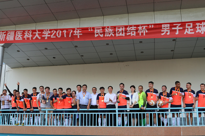 比赛结束后,校领导贾文霄、热娜·卡斯木分别为冠、亚、季军球员颁发奖杯、奖牌并合影留念。