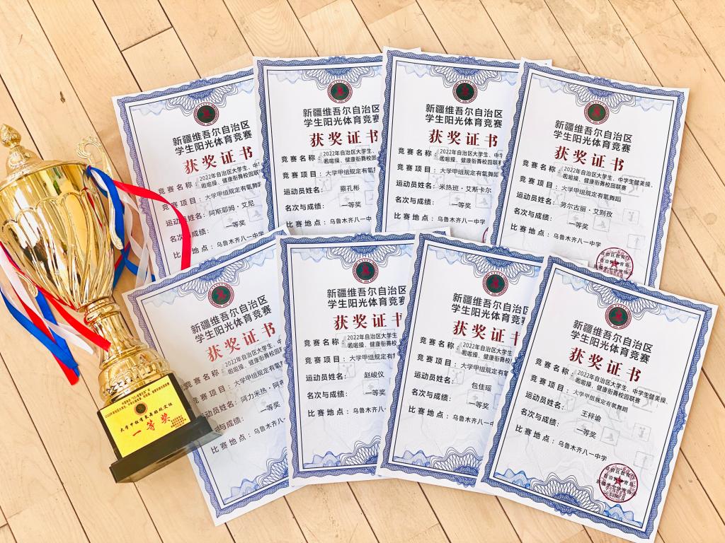 2022年自治区大学生、中学生健美操、啦啦操和健康街舞校园联赛中,beat365在线唯一官网代表队在“大学甲组规定有氧舞蹈”竞赛项目中,喜获一等奖。