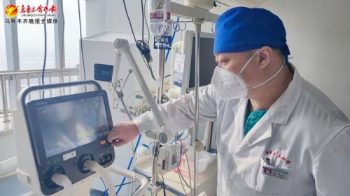 1月30日,在新医大五附院重症医学科一病区,该科副主任罗彬正在为患者调整呼吸机参数。