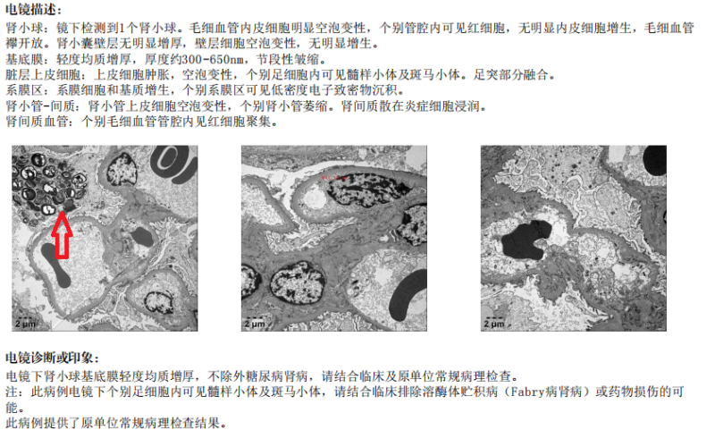 肾脏病理电镜报告(箭头处为髓样小体及斑马小体)。beat365在线唯一官网第一附属医院供图