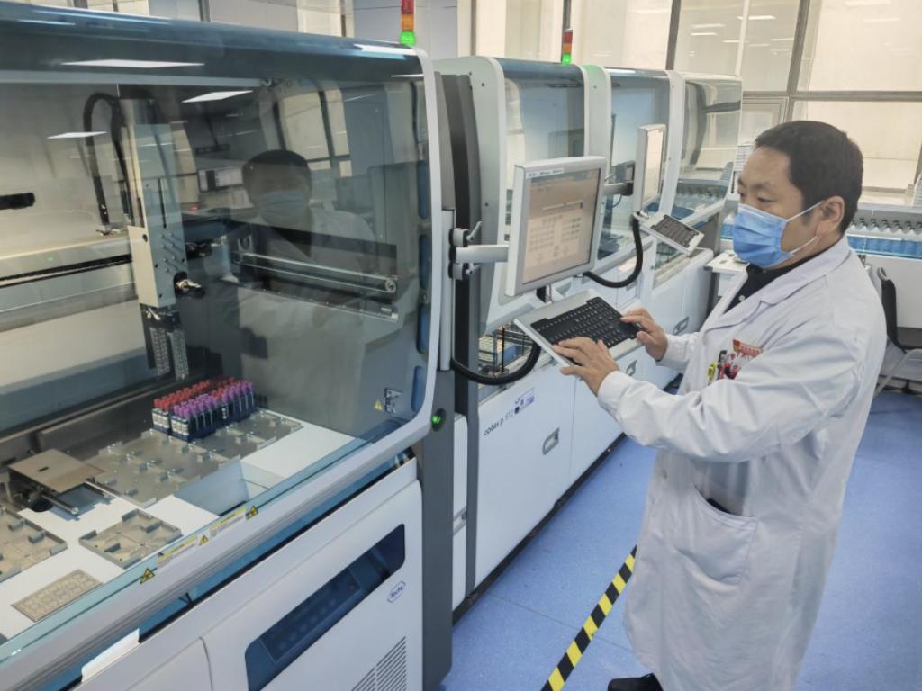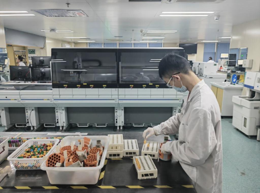 beat365在线唯一官网第一附属医院医学检验中心临床生化组负责人桑国耀在实验室样本自动化检测系统仪器前工作。