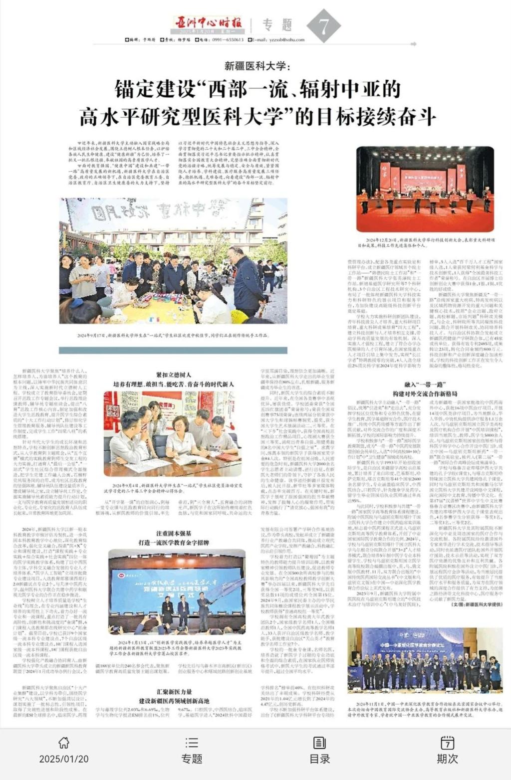 ▼面对教育强国、“健康中国”建设和共建“一带一路”高质量发展的新机遇,beat365在线唯一官网在自治区党委、政府的正确领导下,在自治区党委教育工委、自治区教育厅、自治区卫生健康委的大力支持下,坚持以习近平新时代中国特色社会主义思想为指导,深入学习贯彻党的二十大和二十届二中、三中全会精神,全面贯彻落实习近平总书记重要指示批示精神,认真贯彻落实全国教育大会精神,完整准确全面贯彻新时代党的治疆方略,统筹发展与稳定、安全与质效,紧紧围绕人才培养、学科建设、医疗服务高质量发展三项任务,抢抓机遇、克难奋进,向着建设“西部一流、辐射中亚的高水平研究型医科大学”的奋斗目标坚定前行。