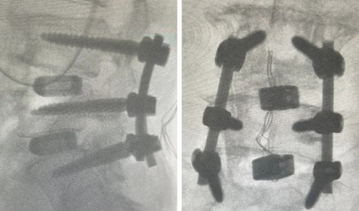 随着人口老龄化趋势不断加剧,腰椎间盘突出症、腰椎管狭窄症、腰椎滑脱等已成为常见的退行性脊柱疾病之一,严重影响中老年人的生活质量和身心健康。腰椎椎体间融合术是解决退行性脊柱疾病的常用手术方式之一。然而,在老年人骨质疏松、骨含量低的情况下,容易发生植骨融合失败的后遗症。3D打印融合器能有效解决这一问题。这两例手术中所使用的融合器,是通过3D打印技术制造的一种新型的多孔钛合金椎间融合器,它的微观和宏观结构模仿了人体椎体的天然骨小梁,更加贴合人体结构。同时,进一步优化了材料表面,使其具有更好的生物相容性和成骨活性,能够帮助新生骨快速长入融合器,加速愈合。该融合器还很适合微创手术,不需要再植入自体骨或其他骨修复材料,不仅提高了治疗效果,还减少了患者的手术创伤。