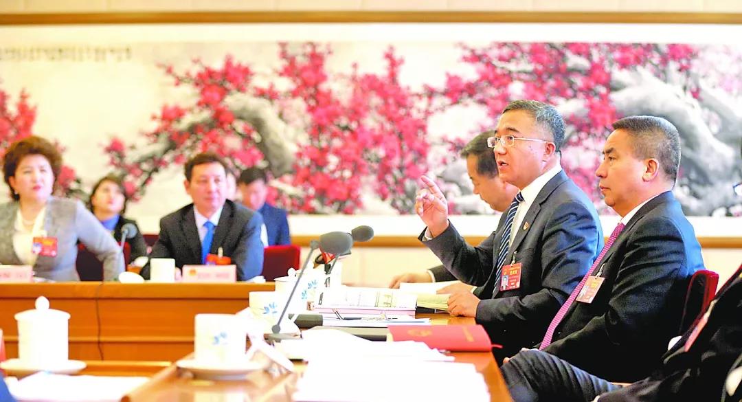3月8日上午,凯赛尔·阿不都克热木代表(右二)在新疆代表团审查预算报告时发言。