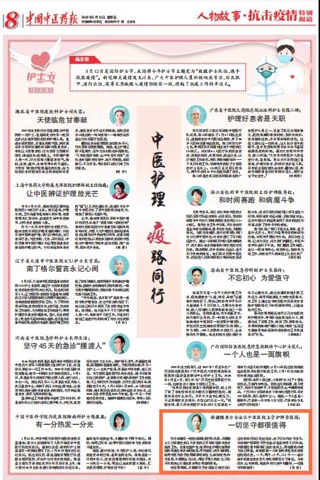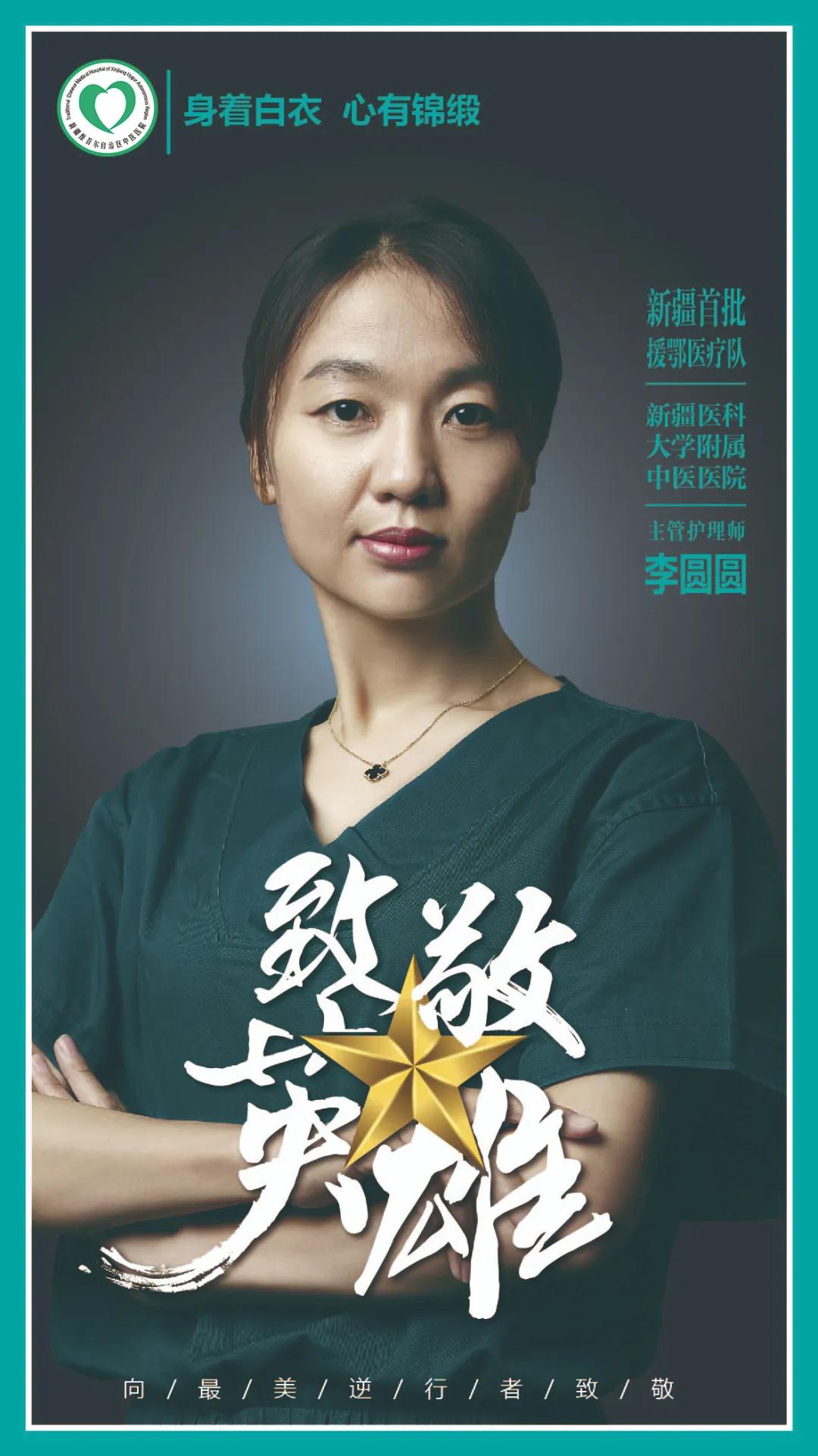 作为新疆第一批驰援湖北医疗队队员,医院体检中心、治未病中心主管护理师李圆圆义无反顾前往武汉大学东院区开展新冠肺炎患者救治工作。在重症监护室,她用专业护理技能帮新冠肺炎重症患者减轻痛苦,尽快康复;在休息时间,她用中医外治手法帮同事缓解压力,解除疲劳;作为党员,李圆圆全力以赴,用超乎常人的毅力、不胜不休的决心为重症患者带去希望的曙光。