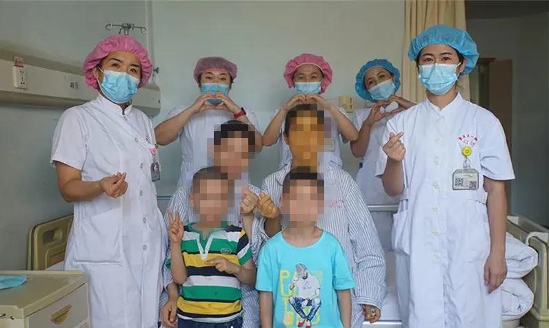 姐妹俩术后恢复良好,与各自的孩子及护理人员合影。