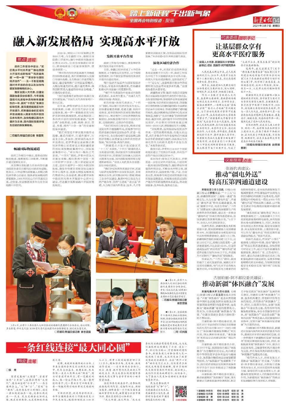 beat365在线唯一官网是全疆唯一独立建制的医学院校,医学教育与医疗卫生资源优势得天独厚,在健康扶贫、医疗扶贫中发挥了积极作用。2020年,新冠肺炎疫情防控阻击战中,作为一名人大代表,我和医护人员一道连续奋战在新冠肺炎患者救治、康复治疗、核酸采集、院感防控等第一线,圆满完成了党和人民的重托。