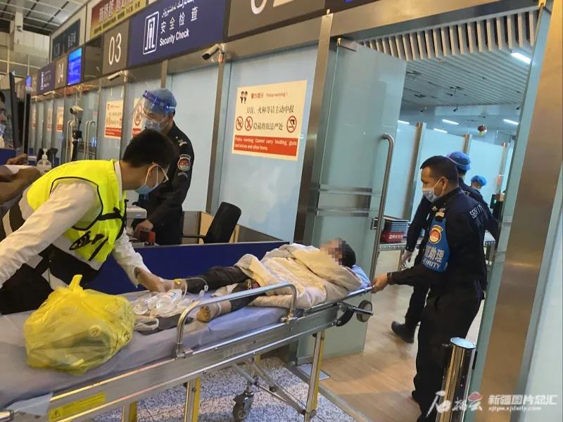 和田机场开启地面绿色通道,使用担架将小麦送至客舱。图/通讯员吴靖祺