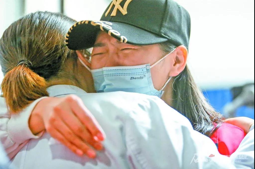 3月12日,在武汉大学人民医院东院,新疆援鄂医疗队队员李秋婷和战友相拥