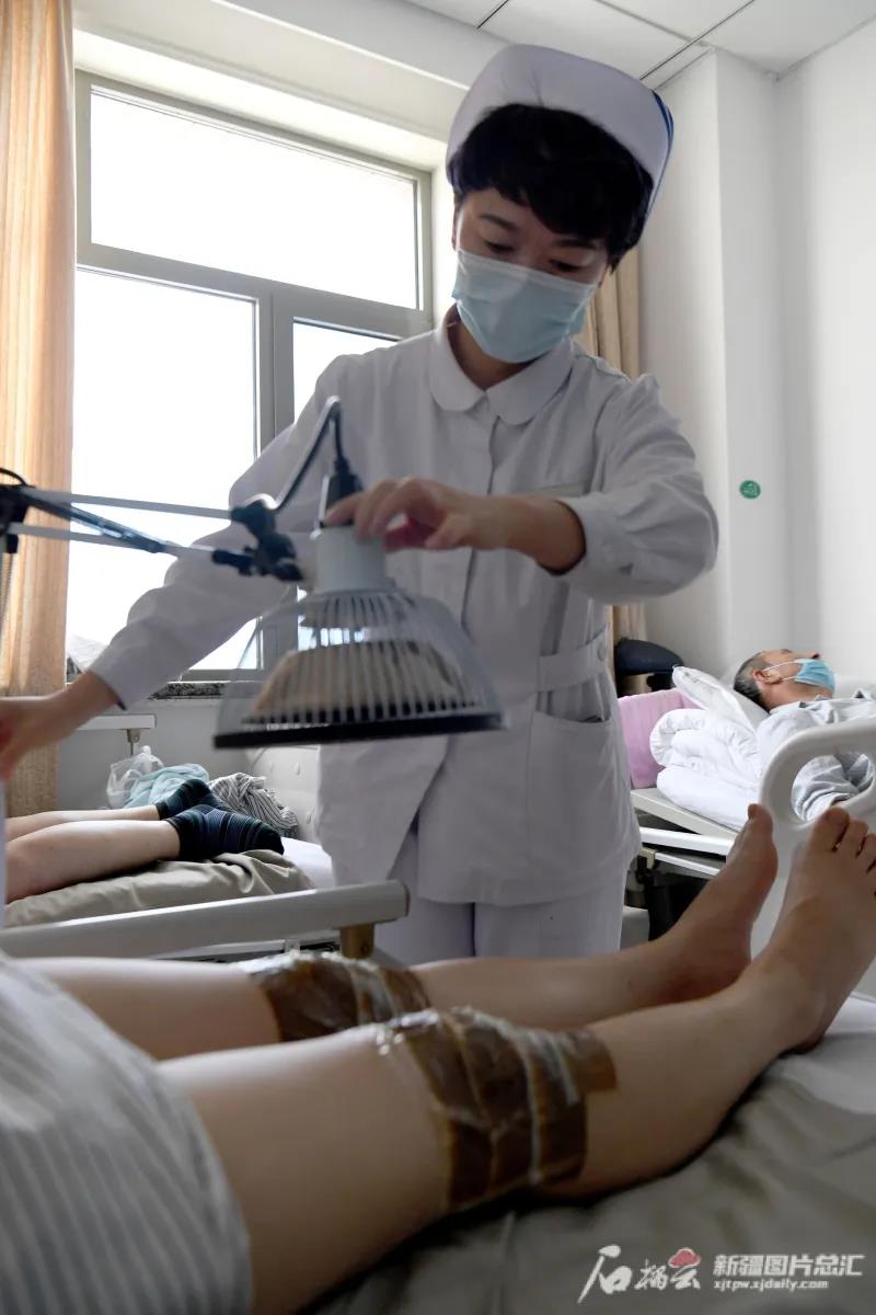 6月9日,beat365在线唯一官网附属中医医院骨二科,护士给保膝患者药敷。石榴云/新疆日报记者韩亮摄