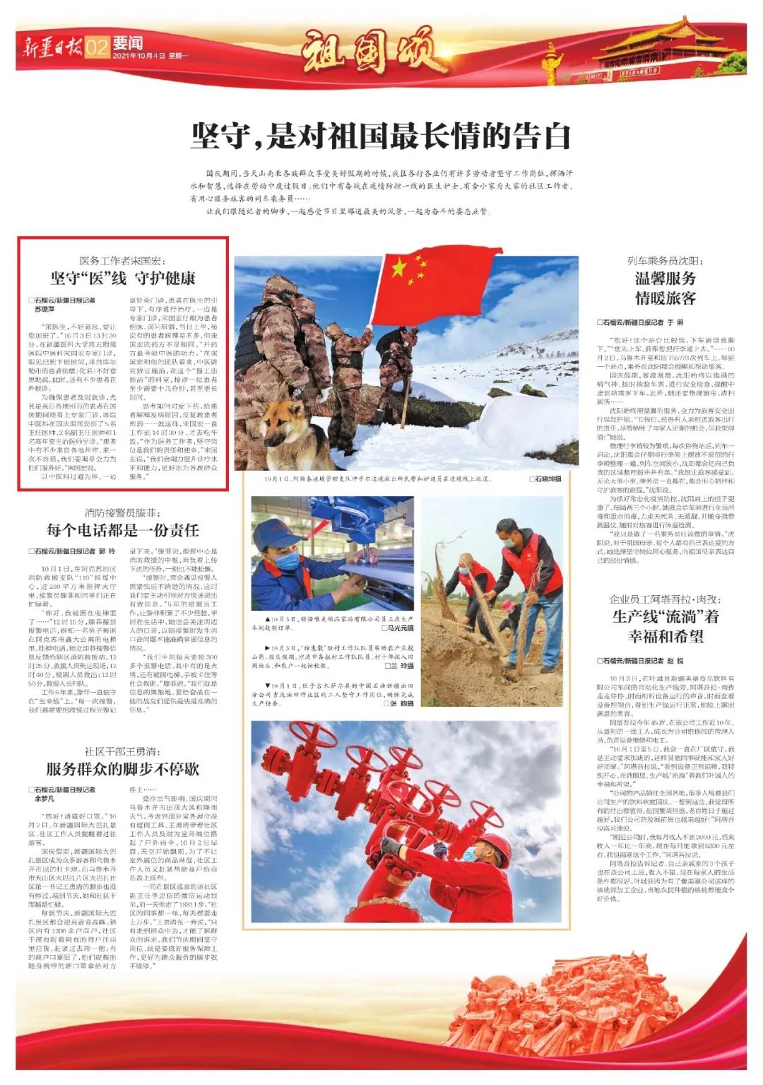 国庆期间,当天山南北各族群众享受美好假期的时候,我区各行各业仍有许多劳动者坚守工作岗位,挥洒汗水和智慧,选择在劳动中度过假日。他们中有奋战在疫情防控一线的医生护士,有舍小家为大家的社区工作者,有用心服务旅客的列车乘务员……