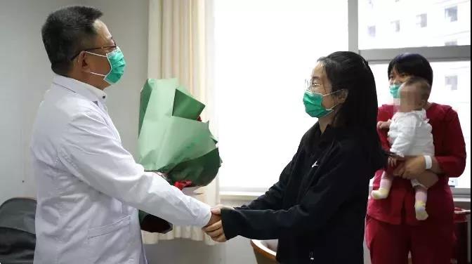 beat365在线唯一官网第一附属医院院长陆晨(左二)与儿科中心医护人员一起看望即将出院的小月