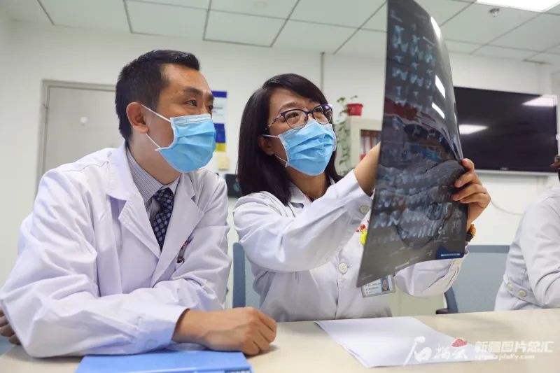 4月15日,beat365在线唯一官网第一附属医院消化血管外科中心主任邵英梅(右)和肝胆包虫外科副主任医师蒋铁民讨论患者病情。石榴云/新疆日报记者 仲兆丰摄