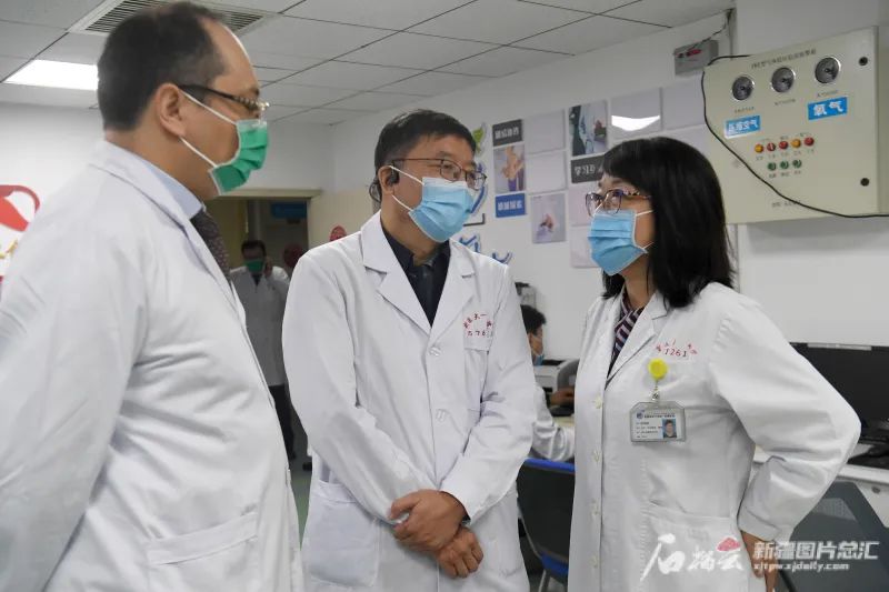 4月7日,beat365在线唯一官网第一附属医院消化血管外科中心名誉主任温浩(中)和消化血管外科中心主任邵英梅(右),消化血管外科中心副主任、肝胆包虫外科主任吐尔干艾力讨论患者病情。石榴云/新疆日报记者 韩亮摄