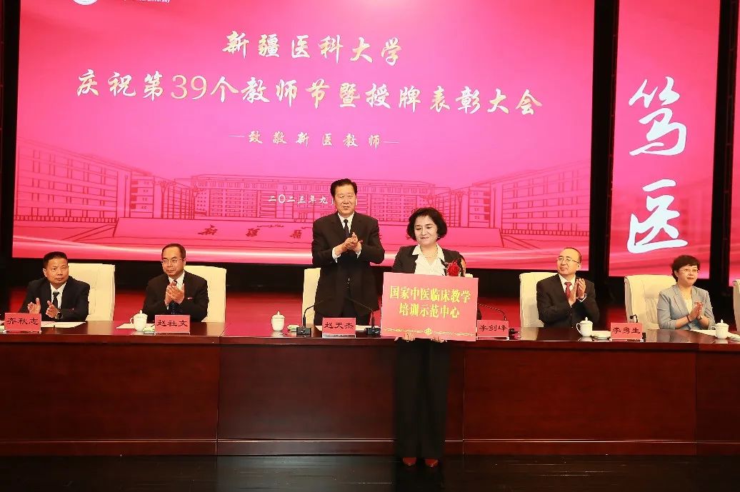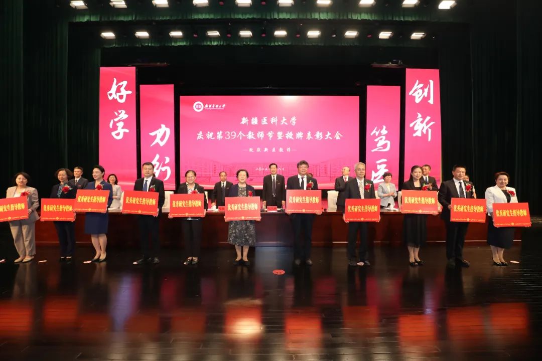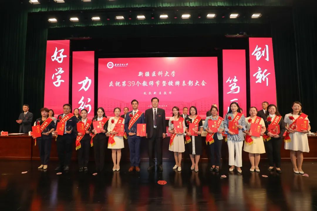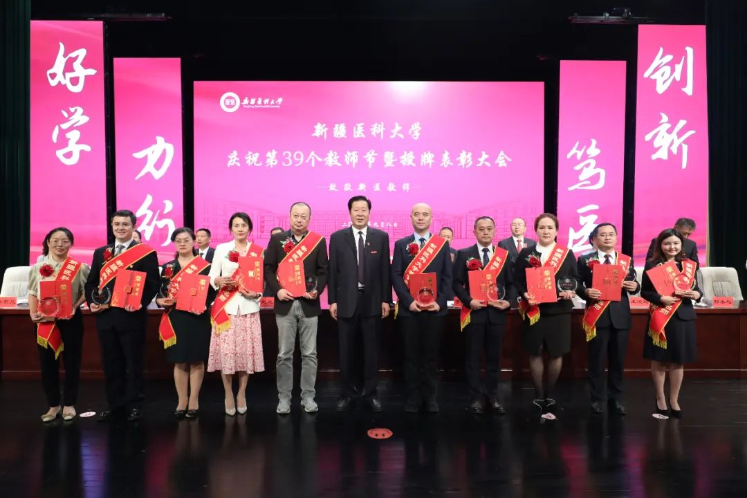 赵天杰代表学校党委,向受到表彰的个人和集体表示热烈祝贺,向长期以来恪尽职守、辛勤耕耘在教学、科研、医疗和管理服务一线的全体新医教师致以节日的问候。他指出,回顾学校67年的办学历程,我们深刻认识到,广大教师是学校建设发展的中坚力量,是学校事业发展的底气所在。学校改革发展前进的每一步,都镌刻着广大教师砥砺奋进的身影。特别是学校第二次党代会以来,在学校党委的坚强领导下,广大教师聚焦“建设西部地区并辐射中亚的一流医科大学”的奋斗目标,坚持“学生为本、学者为先、学科为重、学术为基、学风为要”的工作理念,潜心治学、静心从教、悉心育人,推动学校教育教学事业呈现出了蓬勃发展的良好态势。广大教职员工兢兢业业、默默无闻的付出和努力背后,体现出甘为人梯、淡泊名利、潜心育人的可敬风范,体现出投身科研、矢志创新、追求卓越的崇高境界,体现出爱校敬业、任劳任怨、无私奉献的可贵品质。