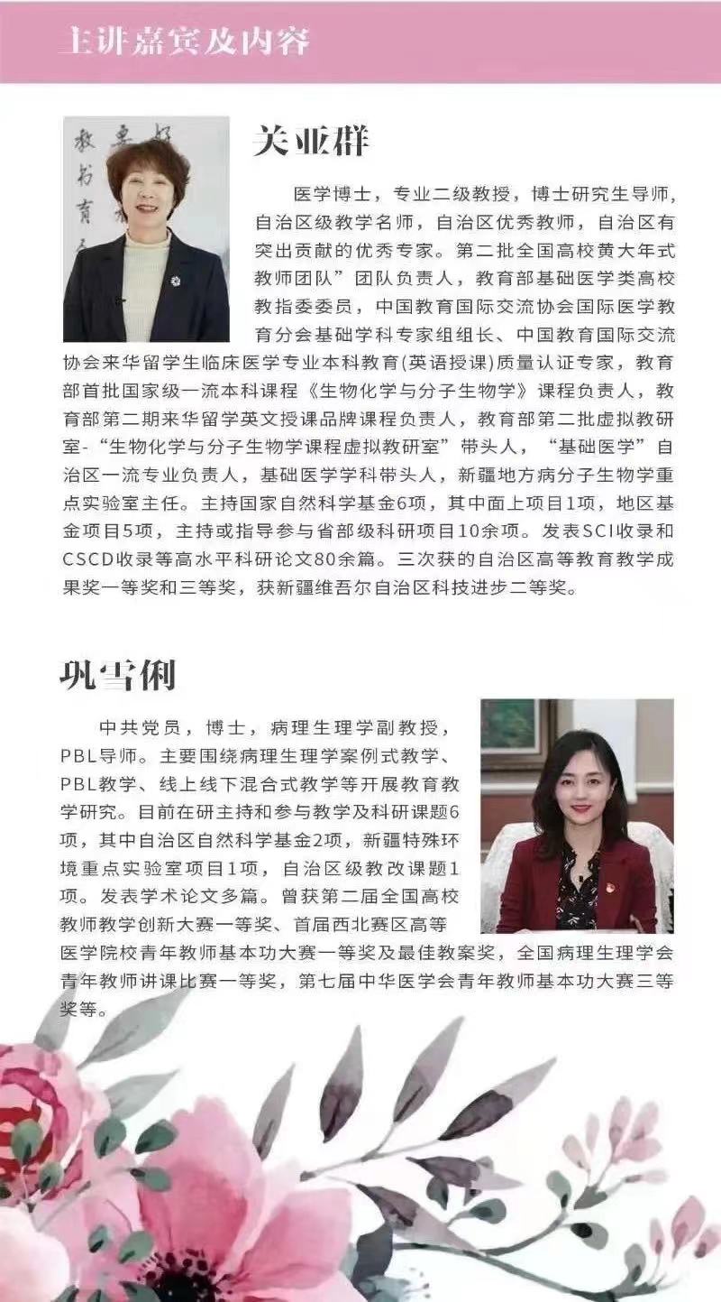 交流分享会上,全国高校黄大年式教师团队负责人、自治区教学名师关亚群教授从教学名师应具备的四个能力入手,结合基础医学院培育名师能手群体的做法和经验,以及多年参加学校教学名师能手评选总结的问题,全面阐述了新时代教师应当具备的素质和能力,面对疫情挑战和信息时代变革,如何精心设计上好线上线下课程,打造“金专”、“金课”,助力教师专业成长,培育更多“金师”,促进人才质量不断提升等内容。
