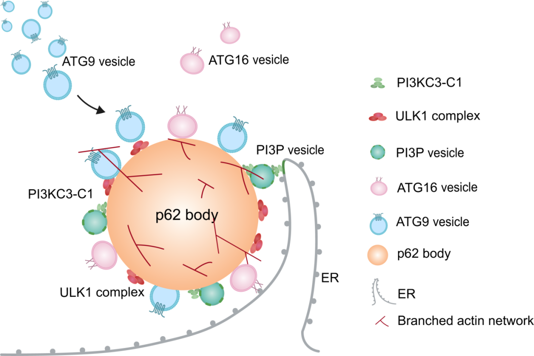 p62体是自噬体形成成核位点的模型。无膜的p62体局部招募自噬体形成所必需的蛋白及膜源,以启动激酶的级联反应及自噬体双层膜结构的形成