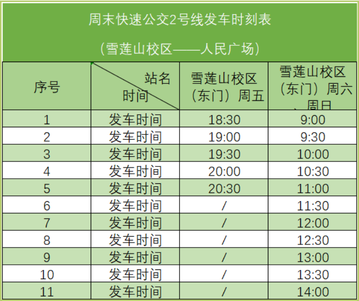(五)雪莲山校区周末快速公交2号线(雪莲山校区——人民广场)