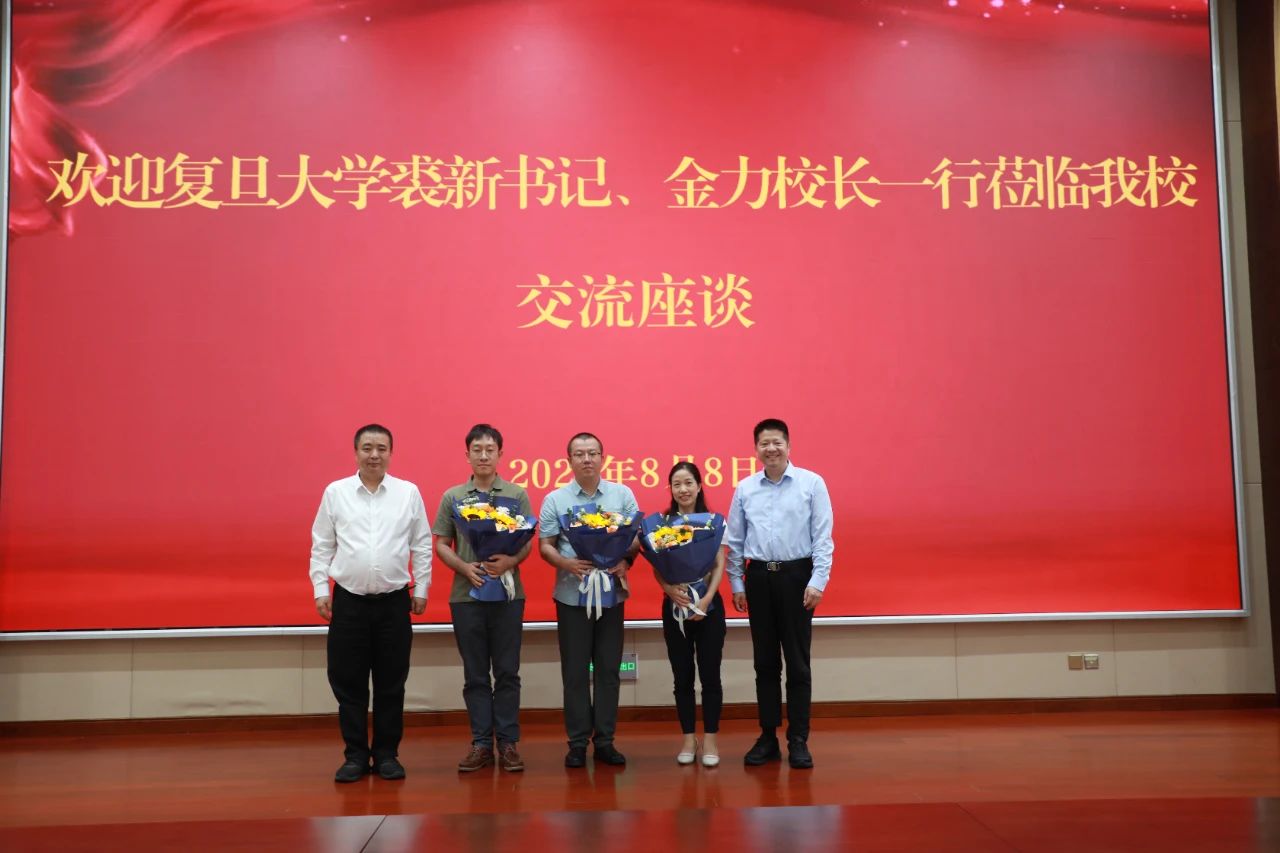 8月8日,复旦大学党委书记裘新,中国科学院院士、复旦大学校长金力一行来beat365与校党委书记柴林交流座谈,校党委副书记、校长阿吉艾克拜尔·艾萨主持座谈会。自治区党委教育工委、自治区教育厅一级巡视员胡军海出席座谈会。