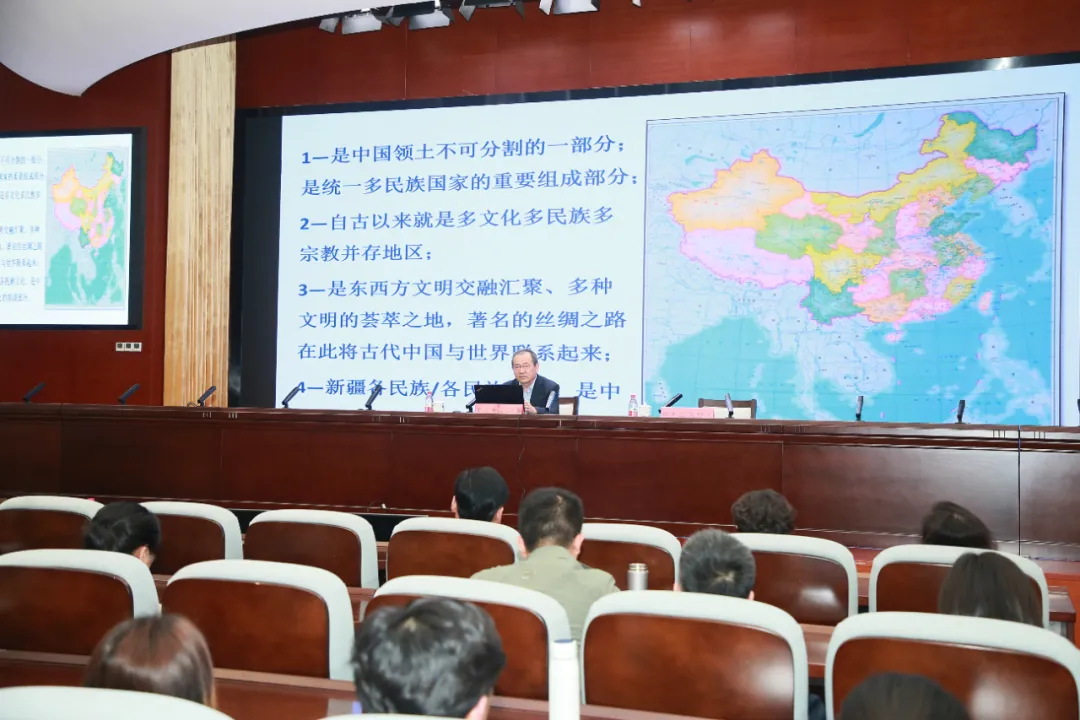 在两个小时的讲座中,于志勇馆长从新疆历史文化资源的价值,准确展示国家治理新疆历史,系统化、知识化、大众化讲好新疆故事,铸牢中华民族共同体意识、增强文化自信,四个方面讲述了新疆是统一多民族国家的重要组成部分,是古代东西方文明汇聚之地和丝绸之路经济带的核心区,还是多元一体中华文化之地。