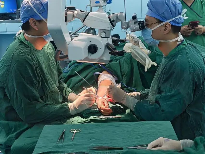 黎立主任与周泓宇医师正在进行上肢的淋巴-静脉吻合手术
